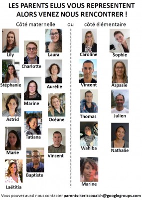 Voici le trombinoscope des parents d’élèves élus au conseil d’école de Keriscoualc’h pour 2025-2026. Ces membres représentent donc tous les parents lors des conseils d’école, qui régissent le fonctionnement de l’école et lors d’interactions spécifiques avec le directeur. N’hésitez pas à les solliciter à l’école, aux entrées et sorties ou par mail
